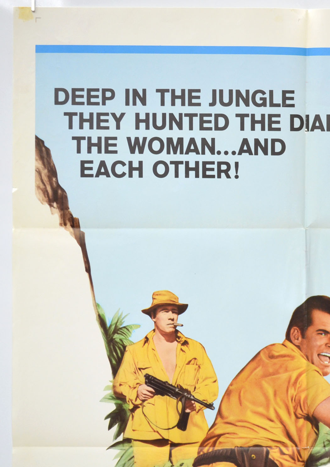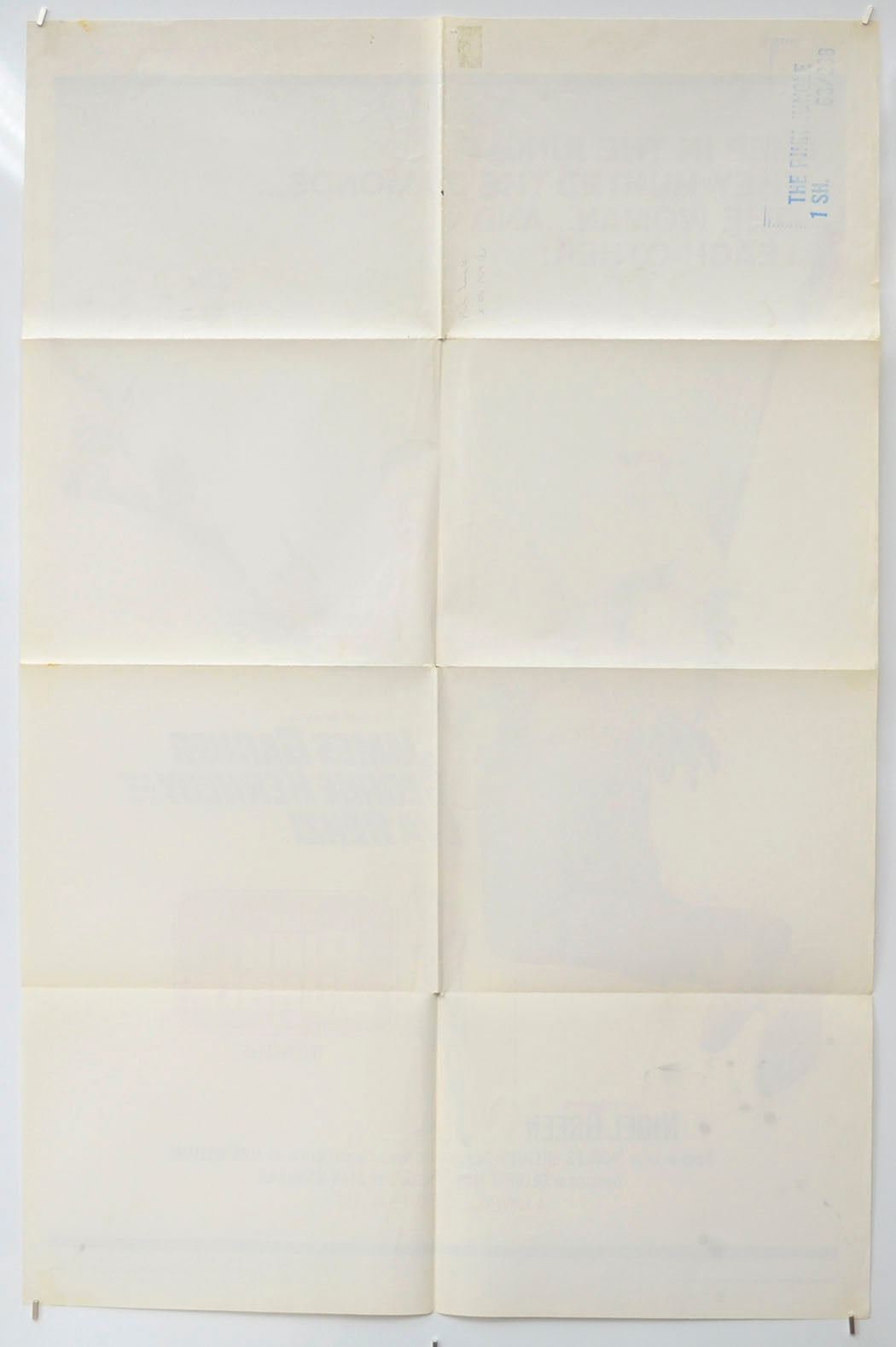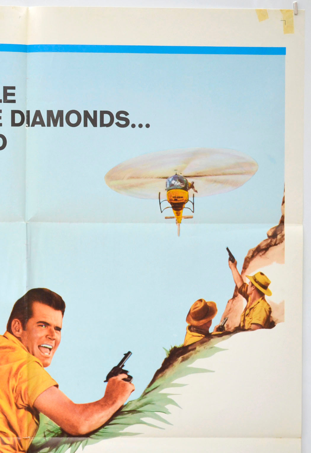 1 to 2 strips of tape adhesive staining near every corner, small tear at the right edge of the top horizontal fold line, approximately four small tears and very mild creasing on the left edge, mild fold wear including a 1 cm tear across each of the three fold intersections, small pinhole tear just below the top center, small circular tear through the bottom of the I in the DIAMONDS text on the center vertical fold line, small patch of sticker adhesive on the back of the top center and the standard blue NSS title ink stamp is on the back of the top left corner area (only noticeable on the front if the poster is held up to the light / backlit), otherwise very good!