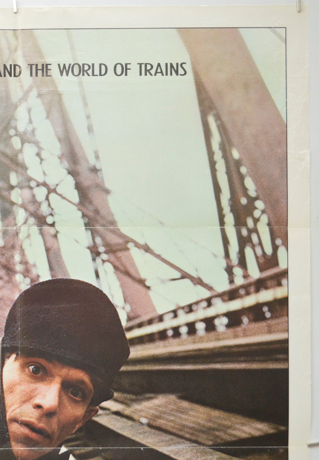Mild edge wear on the top edge including a couple of tiny tears, 18 cm diagonal crease across the top right corner, moderate/heavy surface creasing around the top of the top right corner area, 2 cm tear along with a 1 cm tear and a couple of smaller tears near the top of the right edge, a couple of additional small tears and mild creasing on the remainder of the right edge, tiny piece torn from the right edge (just below center), extremely tiny piece torn from the bottom edge (near left corner), five small tears and mild creasing on the left edge (mostly near the bottom), tiny piece torn from the left edge (below center), small blu-tac grease stain in the left white border (near bottom) and another at the same level in the right white border, small strip of surface paper loss in the left white border (above the top horizontal fold line), three additional light horizontal fold lines completely across the poster (above and below the text at the top), three more additional horizontal fold lines completely across the poster (just below the title), 3 cm vertical white crease line to the right of the train tracks just below the center horizontal fold line, a couple of light surface creases above the man’s hand, 8 cm and a 14 cm diagonal light surface crease within the right of the train tracks (just above the bottom horizontal fold line), additional light surface creases throughout, approximately 8 pinholes near both top corners (some have torn together), 2 to 4 pinholes near the bottom corners, fold wear (white stress marks on and around the fold lines), blu-tac grease/residue on the back of the corners and the backs of the fold lines have yellowed (only noticeable on the front if the poster is held up to the light / backlit), otherwise okay.