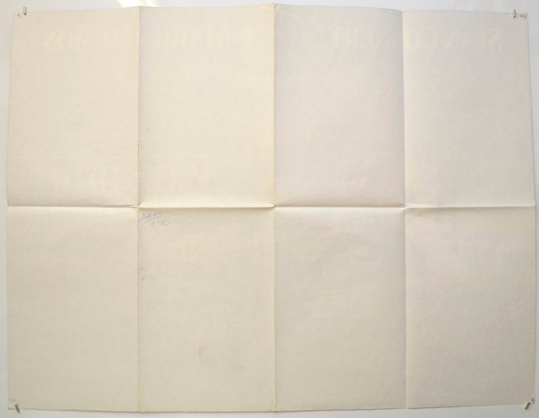 2 to 3 pinholes near every corner (the pinholes near the top left corner have torn together creating a small hole), extremely mild edge wear at the top of the left vertical fold line, extremely mild creasing on the bottom edge, pinhole near the center of every edge (two near the top center), approximately five pinholes within the water area on the right, pinhole just below the car, light creasing around the fold intersections, a little blu-tac residue on the back of each corner, slight Browning to the back of the right vertical fold line and the title has been written on the back in Biro (all only noticeable on the front if the poster is held up to the light / backlit), otherwise very good.