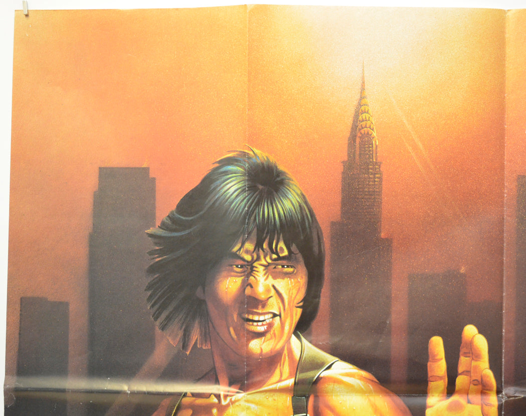 Two pinholes near every corner, four pinholes between the center of the left edge and Jackie Chan’s shoulder, mild fold wear (stress marks on the fold lines and additional creasing around some the fold intersections), some light surface creasing within and below the TE in the in PROTECTOR, 4 cm light diagonal crease above Jackie Chan’s right shoulder, some very light surface wrinkles throughout, title written on the back of the top edge in blue Biro (only noticeable on the front if the poster is held up to the light / backlit), otherwise very good.