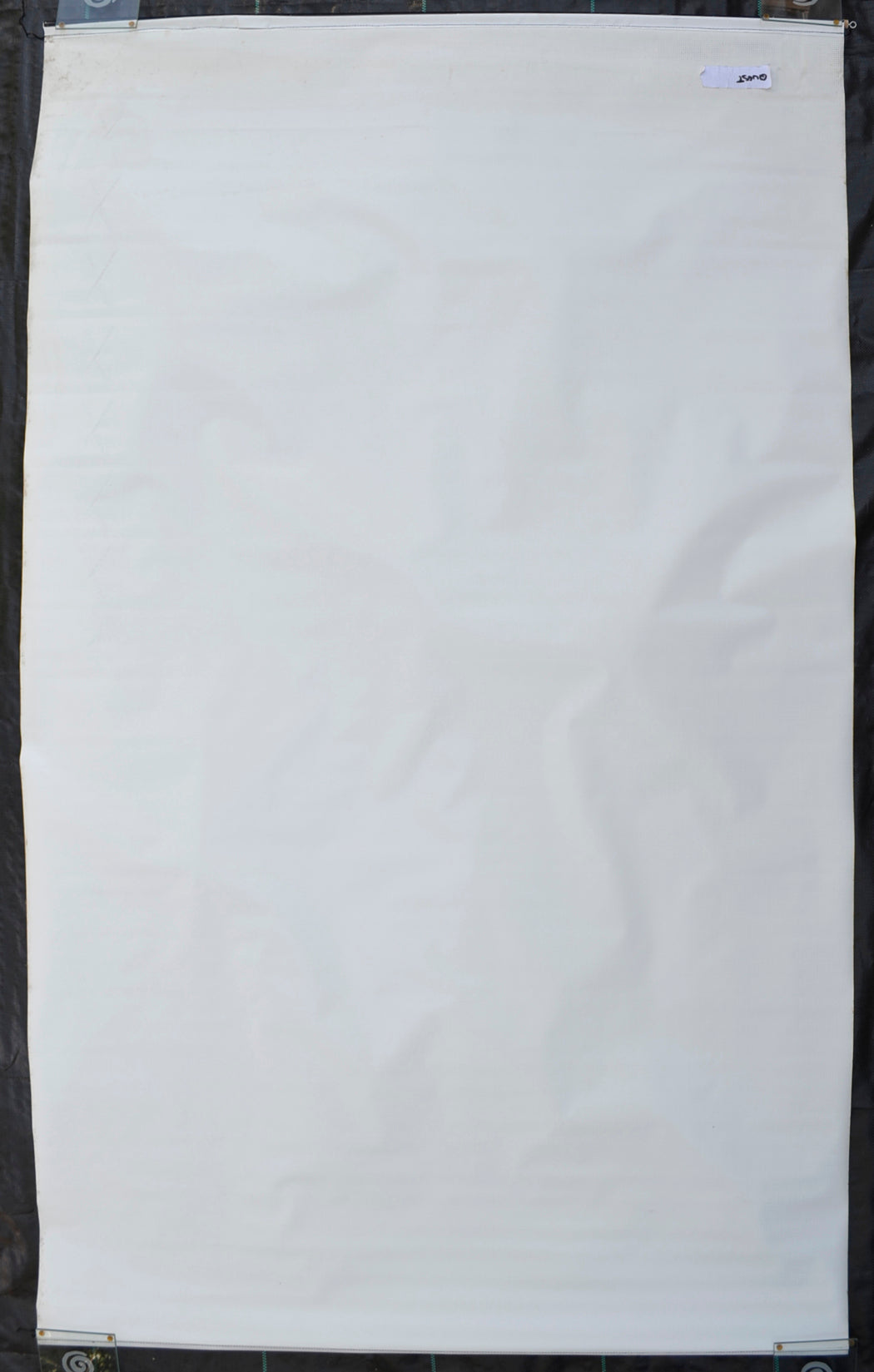 A few specks of print loss on the tip of the top edge, some very light indentations from a rubber band around the top of the side edges (should dropout), very light patches of damp on the back of the right edge (should wash off with a light detergent solution), otherwise very good! Complete with original top and bottom wooden poles.