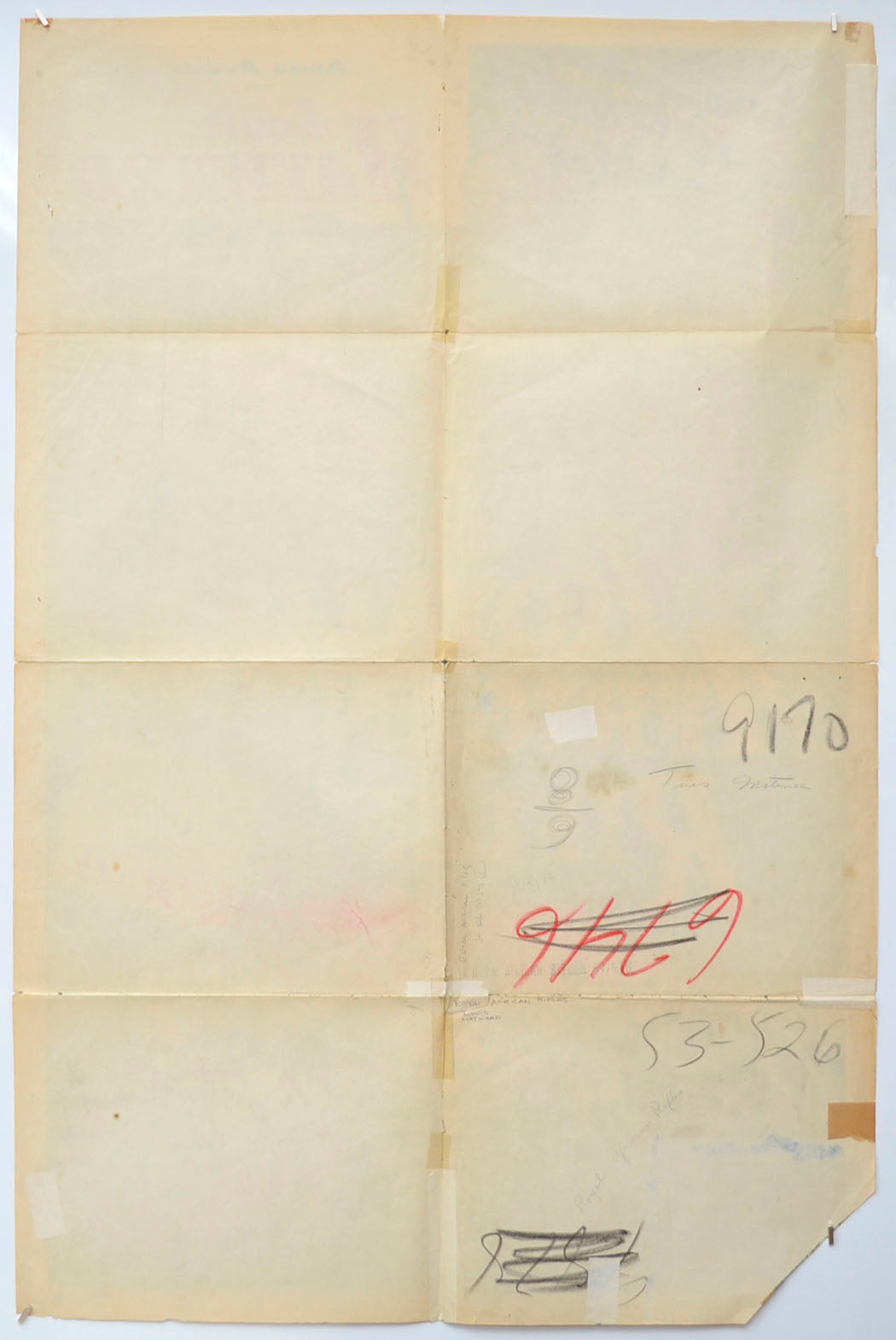 17 x 2 cm horizontal strip of surface paper loss and a 14 cm vertical strip of surface paper loss on the back of the bottom left corner area (only noticeable on the front if the poster is held up to the light / backlit), approximately 3 pinholes near every corner (some are several inches inward of the edges), 1-2 pinholes near the center of both side edges.