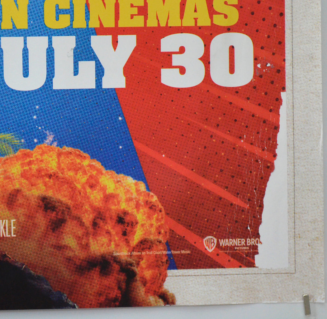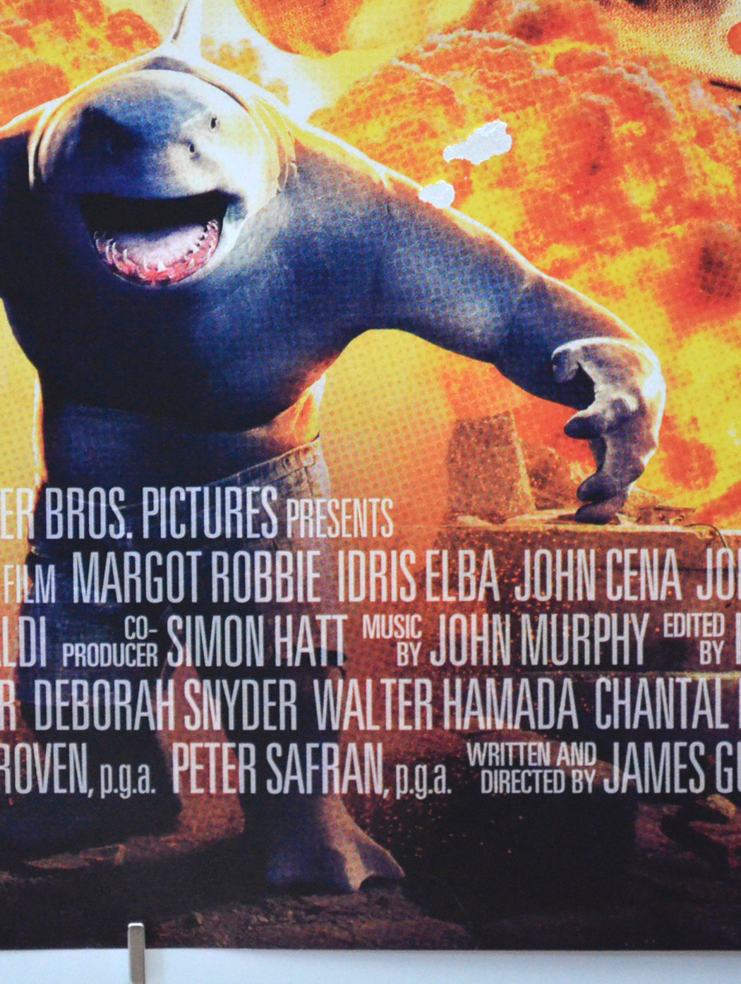 The poster was displayed in an external frame on a Cinema wall which unfortunately allowed a little water ingress which has led to a 13 x 3 cm patch of print loss from the red background at the bottom right corner area, this has also created a slight kink in the poster around the bottom right corner area, 1 cm patch of print loss and a smaller patch just above king shark’s right arm, tiny tear on the top edge, very mild creasing on the bottom edge, 2 cm light circular indentation within both bottom corners, otherwise good (in my opinion it still displays well).