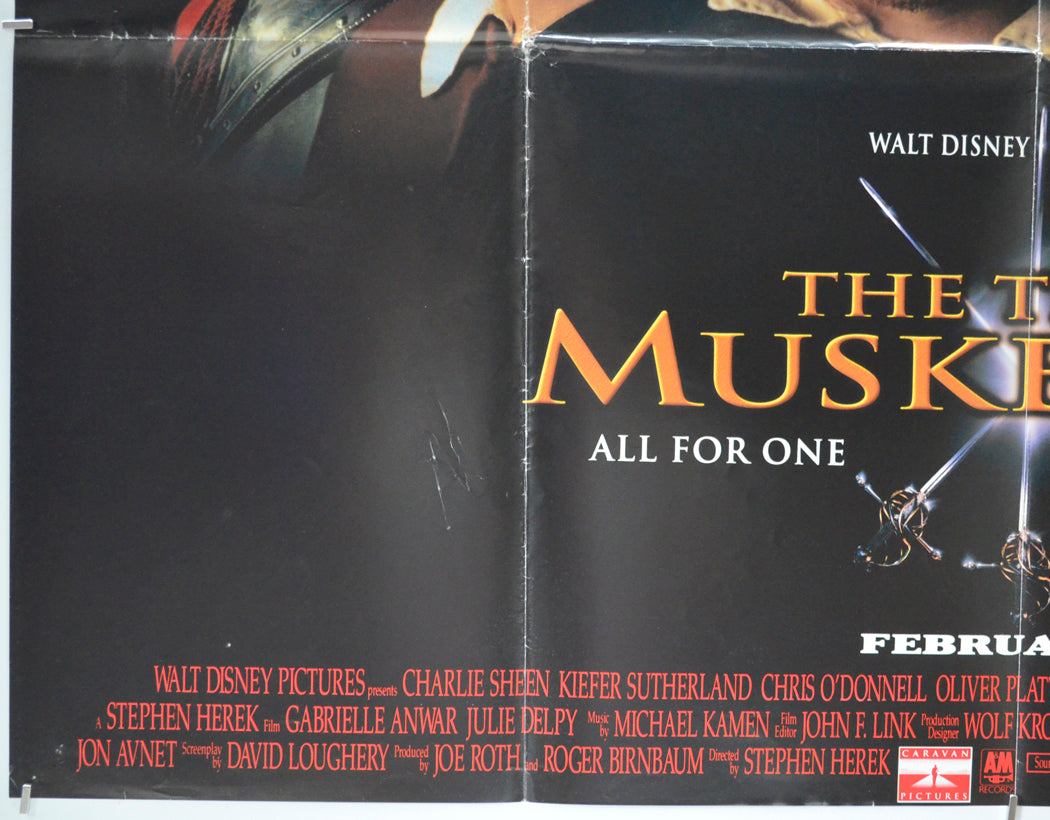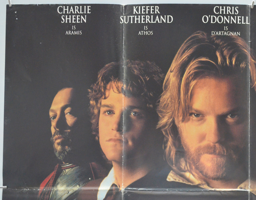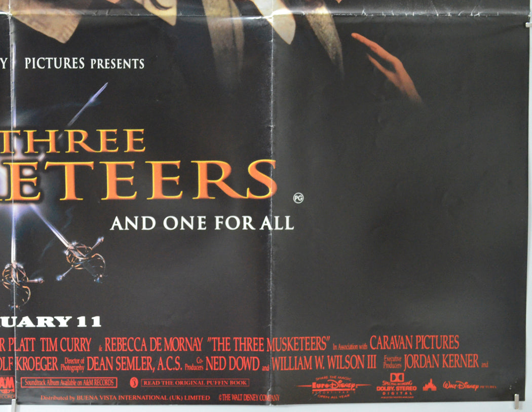 Two tiny tears on the top edge, 3 cm diagonal crease across the top left corner, three tiny tears on the bottom edge, small diagonal crease across the bottom left corner, 2 to 4 pinholes near every corner, additional tiny pinhole just above the Walt Disney credit near the bottom left corner, three 5 cm diagonal white crease lines which are joined together in an N shape just left of the M in MUSKETEERS, mild fold wear (white stress marks on the fold lines and additional creasing around the intersections along with a tiny wear hole at the left intersection), small sticker on the back of the poster (only noticeable on the front if the poster is held up to the light / backlit), otherwise good.