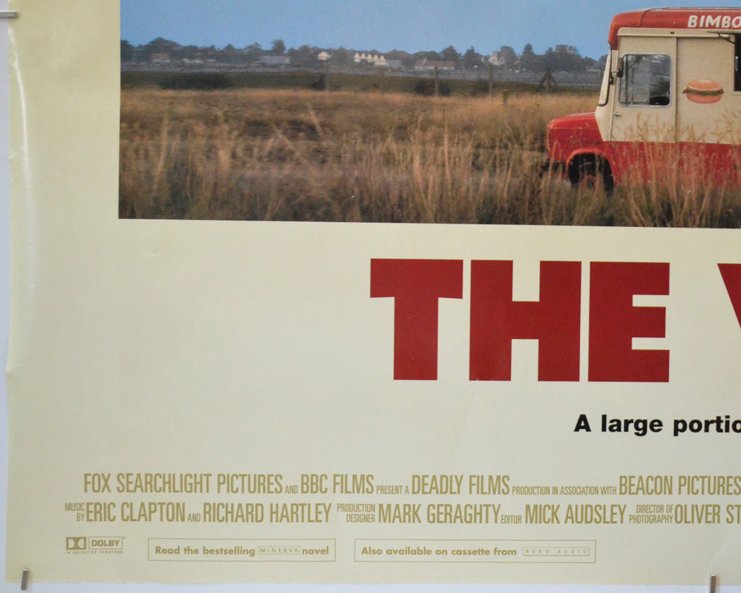 Pinhole and several tiny indentation dots around the top left corner, some additional indentation dots just below the top edge, very mild creasing on the top edge, some indentations lines near the top right corner, light creasing across the bottom right corner, mild creasing on the bottom edge, small white surface crease patch within the blue sky to the right of the van, small white crease patches within the V in the title and a small patch of creasing below the H in THE, band of light surface creasing above the left half of the credits block, some additional light surface creasing here and there, small patch of blu-tac grease/residue in the cream border above the image of the van, blu-tac grease/residue on the back of the corners, otherwise good.