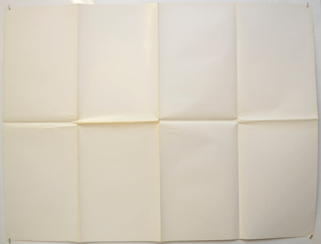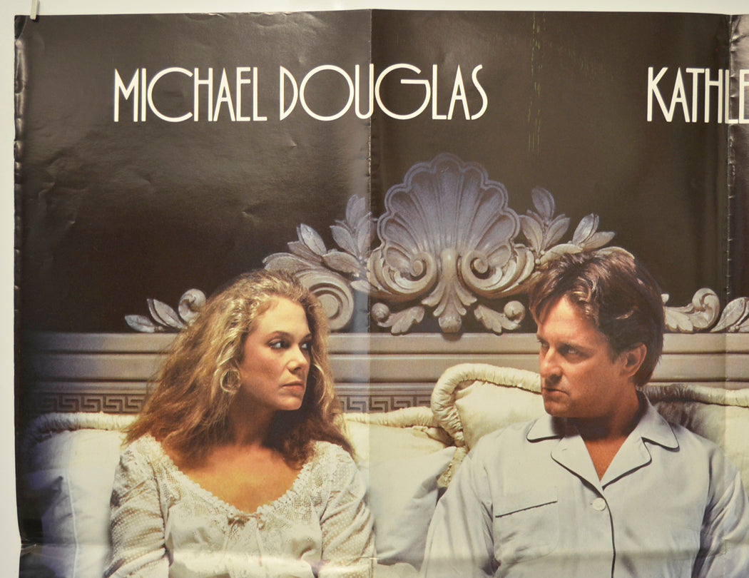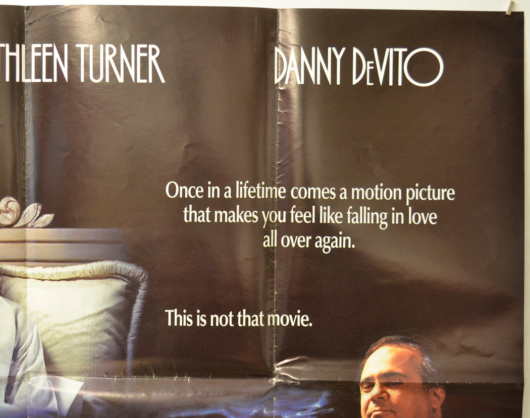 Small crease across the top left corner, mild creasing at the top of the left edge, 10 x 2 cm band of tiny vertical greenish print error lines in the black background between the Douglas and Kathleen credits at the top with a few additional very faint lines within the area also, 7 cm fine greenish print error line to the left of the Danny DeVito credit at the top, very mild fold wear including a few stress marks on the fold lines plus creasing around the fold intersections, slight Browning to the back of a couple of fold lines (not visible on the front), otherwise very good.