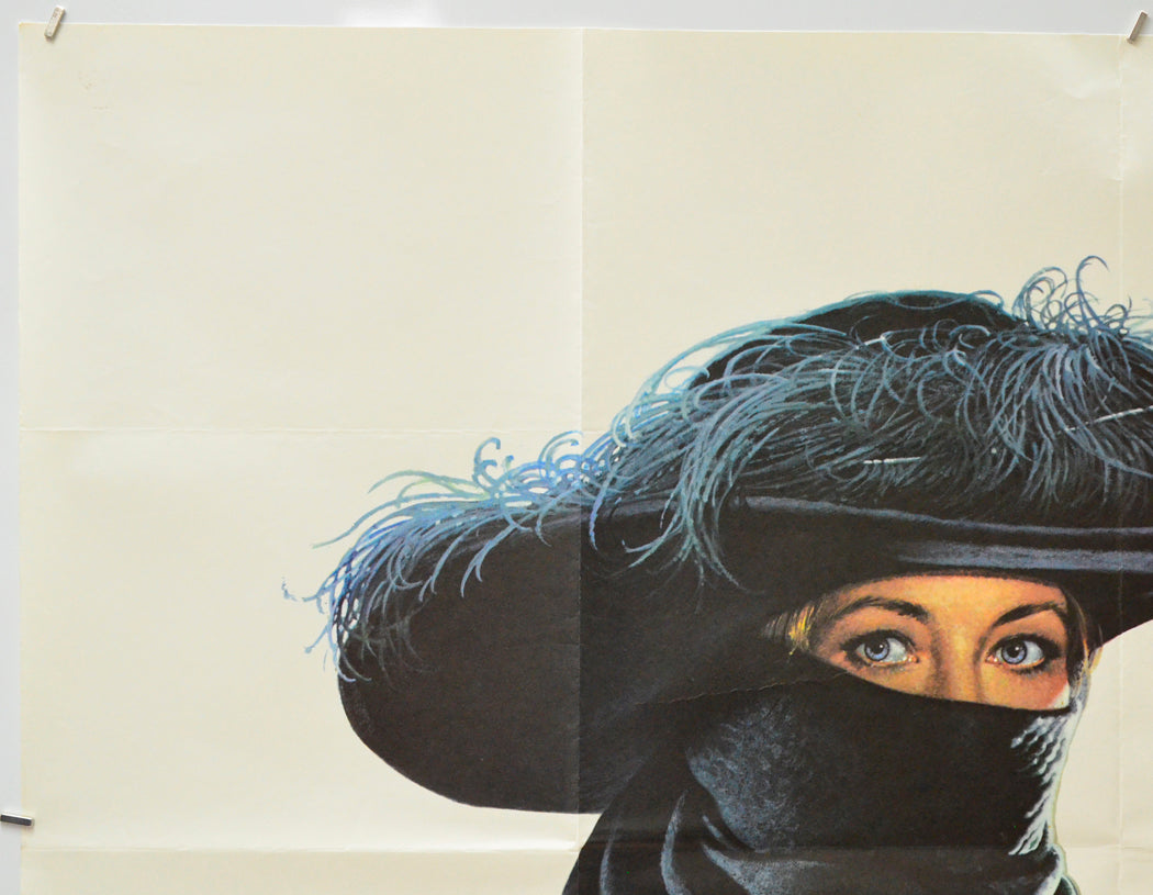 3 cm diagonal crease across the top left corner, a little blu-tac grease/residue? near every corner, two tiny tears and mild creasing at the bottom of the right edge, 5 cm diagonal crease across the bottom right corner, 3 cm horizontal crease near the bottom of the right edge (level with the woman in blue), 1 cm diagonal crease across the bottom left corner, a couple of faint horizontal indentation lines just above the bottom edge (probably marks from a cinema frame), a couple of tiny faint Brown spots of damp (foxing) near the top half of the right edge, 11 cm horizontal crease from the left eye into the left of the hat of the main character, light creasing around some of the fold intersections (note there are three horizontal and three vertical folds), otherwise very good!Double Sided :