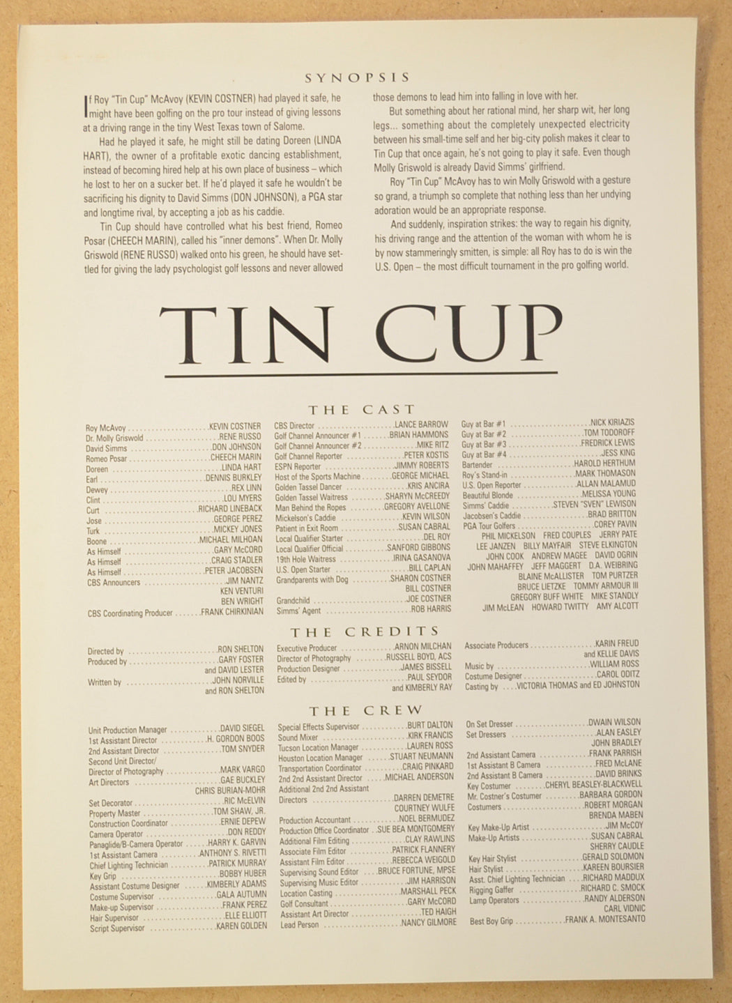 “Tin Cup” Original Cinema Exhibitors Press Kit
