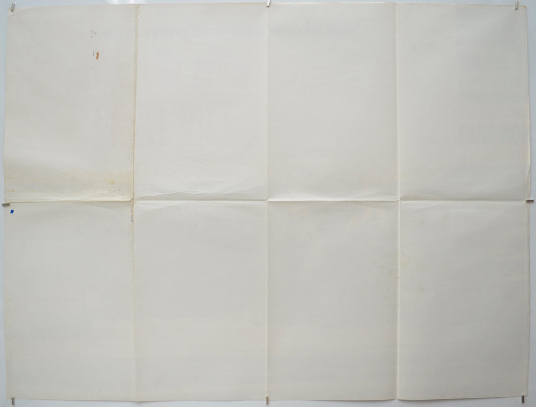 Extremely mild creasing on the top edge, very mild edge wear on the left edge, there is a tiny slither of white unprinted paper at the tip of the bottom half of the right edge, indicating the poster may have been printed VERY slightly out of alignment, 1 cm square of blue felt pen on the back of the center of the right edge area (this is lightly visible on the front just above the car), 1 cm thin dark Brown liquid stain along with approximately 4 smaller splashes on the back of the top right quarter of the poster and there is also a very faint 26 x 6 cm area of light Brown water splashes on the back of the right of the center horizontal fold line area (all only noticeable on the front if the poster is held up to the light / backlit), extremely mild fold wear including two tiny separations on the right fold intersection, pinhole near both top corners, the title has been written on the back in blue Biro (again only noticeable on the front if the poster is held to light/backlit), otherwise very good.