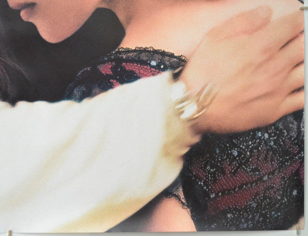 4 cm diagonal crease and two 2 cm diagonal creases along with additional creasing plus a tiny tear at the top of the left edge, 1 cm tear and a tiny tear along with very mild creasing at the bottom of the left edge, two tiny tears and moderate creasing/edge wear on the right edge (mostly near the top and just below the hand), approximately 12 small white surface creases within Winslet’s hair at the top including a 4 cm vertical crease, three small greyish scuff marks within DiCaprio’s sleeve, some greyish print has transferred into the light background near the left half of the top edge, otherwise good.