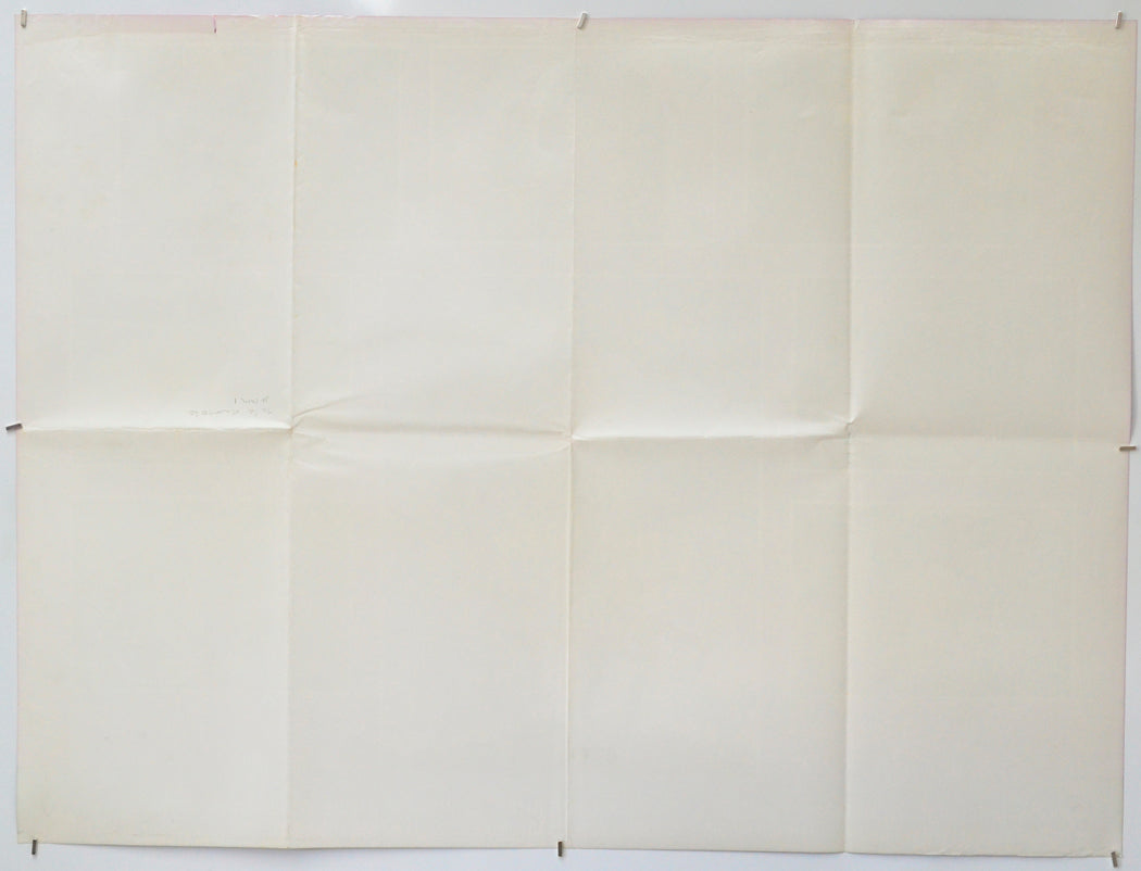 2 cm tear and a tiny tear on the top edge (right), horizontal crease/fold line just below the top edge (goes off a slight diagonal around the corners), some surface wrinkles on the right of the top edge indicating the area may have become slightly damp at some point (no apparent staining though), two tiny tears near the bottom of the right edge, two tiny tears and extremely mild creasing on the bottom edge, tiny white print speck at the top of the left edge, light creasing around the fold intersections, a couple of tiny Brown spots of damp (foxing) on the back of the right vertical fold line (not noticeable on the front), otherwise very good.Double Sided :
