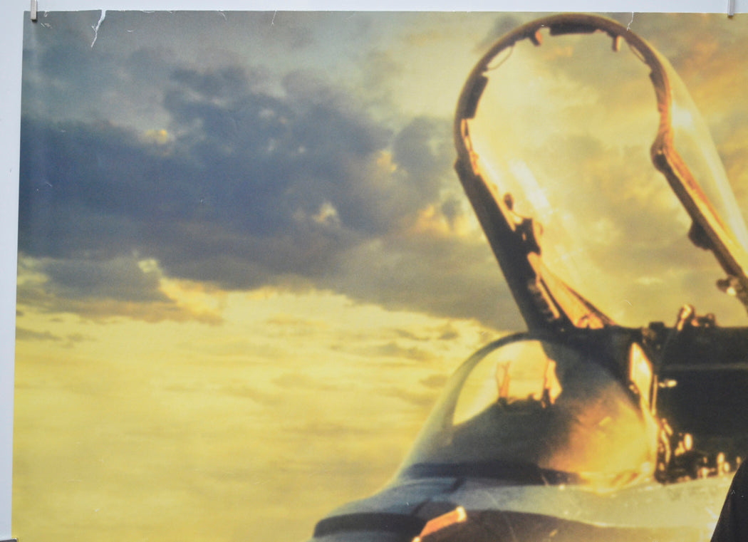3 cm tear and three 1.5 cm tears plus a couple of extremely tiny tears on the top edge along with mild creasing/edge wear, a couple of extreme tiny tears and moderate creasing/edge wear on the bottom edge, there is a slight crimping to the top and bottom edges and there is a faint horizontal indentation line across the poster near both the top and bottom edges indicating the poster was probably displayed in a cinema snap frame and may have become very slightly damp at some point (no apparent staining though), 1 cm thick white crease patch along with several tiny white creases within and around the nose of the plane, 2 cm thick white crease line just above the M in TOM, a couple of tiny white creases through the left eyebrow and some additional light creasing to the left of his head, the surface is fairly creased/wrinkled throughout the side thirds of the poster including several white stress marks, 4 cm horizontal white crease line and some other white stress marks near the right edge, blu-tac grease on the back of the corners, three tiny specks of print loss near the top left corner, otherwise okay.