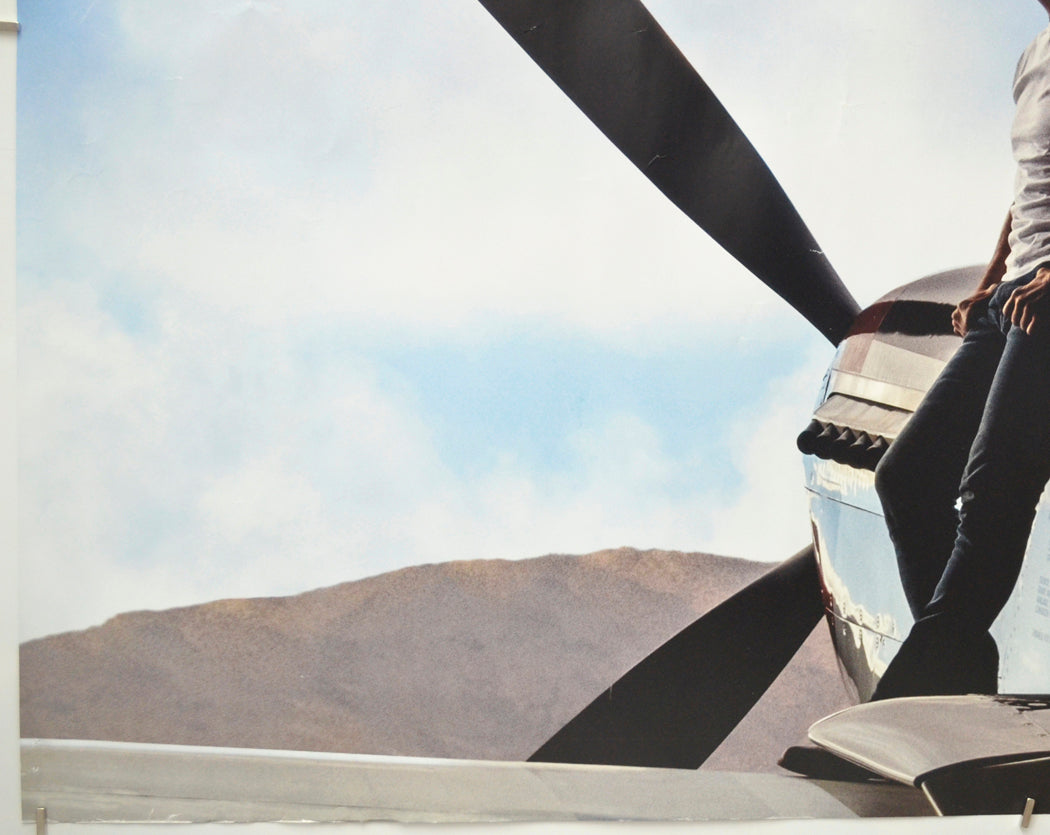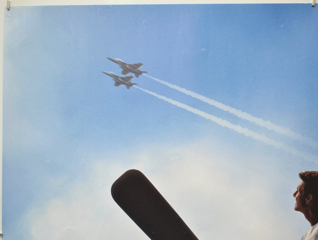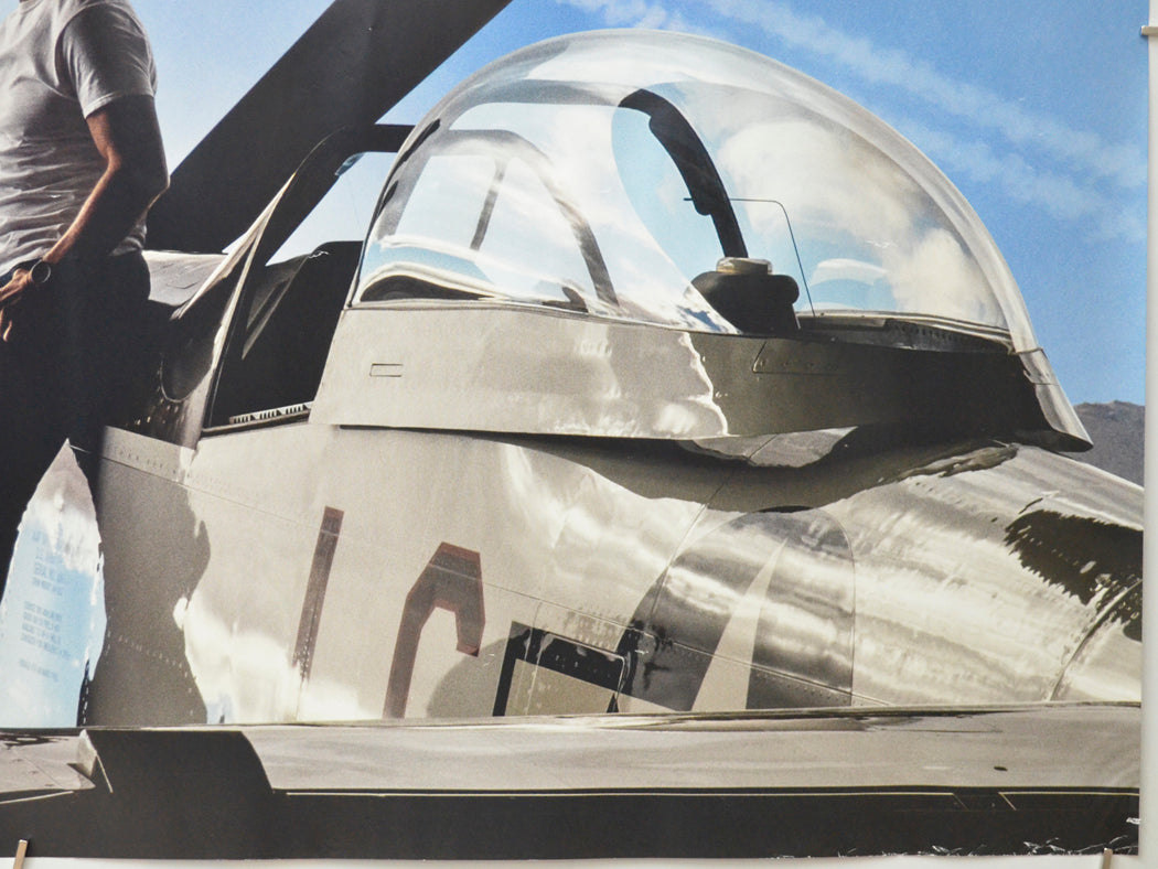 Pinhole near every corner (some have torn slightly including the one near the bottom right corner which has torn through to the edge), additional pinhole near the bottom left corner, extremely mild creasing/edge wear on the top edge, 1 cm diagonal crease across the top right corner, 1 cm diagonal crease and a 4 cm crease across the bottom right corner, approximately four tiny tears and mild creasing/edge wear on the bottom edge, small spot of blu-tac grease/residue either side and just above the center of the IN CINEMAS AND IMAX text (there is a tiny speck of print loss within spot of blu-tac grease on the left of this), slight crimping to the surface around the corners indicating the edges may have become slightly damp within a cinema frame (no apparent staining though), several small white surface creases below the top edge including within the title and Tom Cruise credit area, horizontal band of small white surface creases completely across the poster (going just above Cruise’s head) and another band of slightly larger creases going through Cruise’s waist level, numerous light surface creases near the left edge, approximately three tiny white surface creases just below the cockpit of the plane, faint fine 14 cm blue print error/scuff line below the two airplanes and a couple of smaller fine blue lines near the top left corner, otherwise good.
