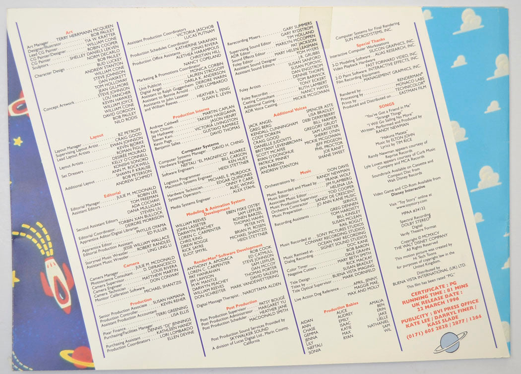 “Toy Story” Original Cinema Exhibitors Synopsis / Credits Booklet (UK)