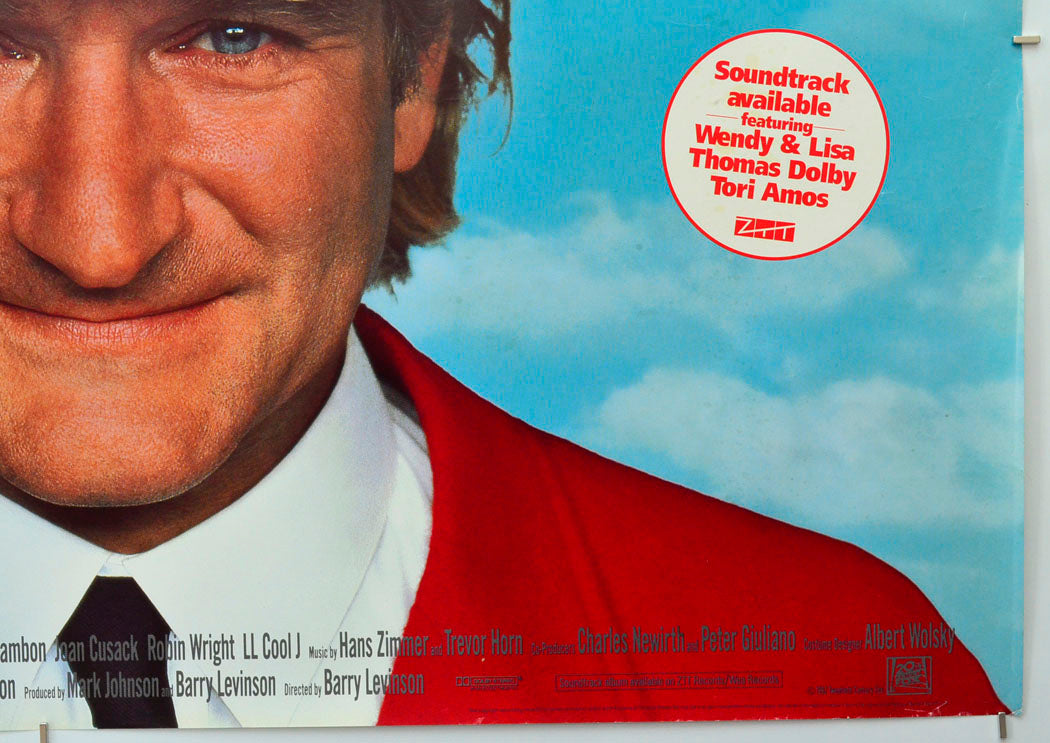 POOR! - Numerous small grease stains? throughout the whole poster (most noticeably within a 4 inch (10 cm) band spanning top to bottom going through the soundtrack circle) Some of these have bled through to the back of the poster as well, extremely mild creasing on the top edge, a few small creases around the center of the right edge, very light vertical crease from the center of the right edge down to the bottom, mild creasing on the bottom edge, tiny spot of popcorn residue? On the left collar, the actual image of Robin Williams is very good and appears to have been spared from any grease stains.