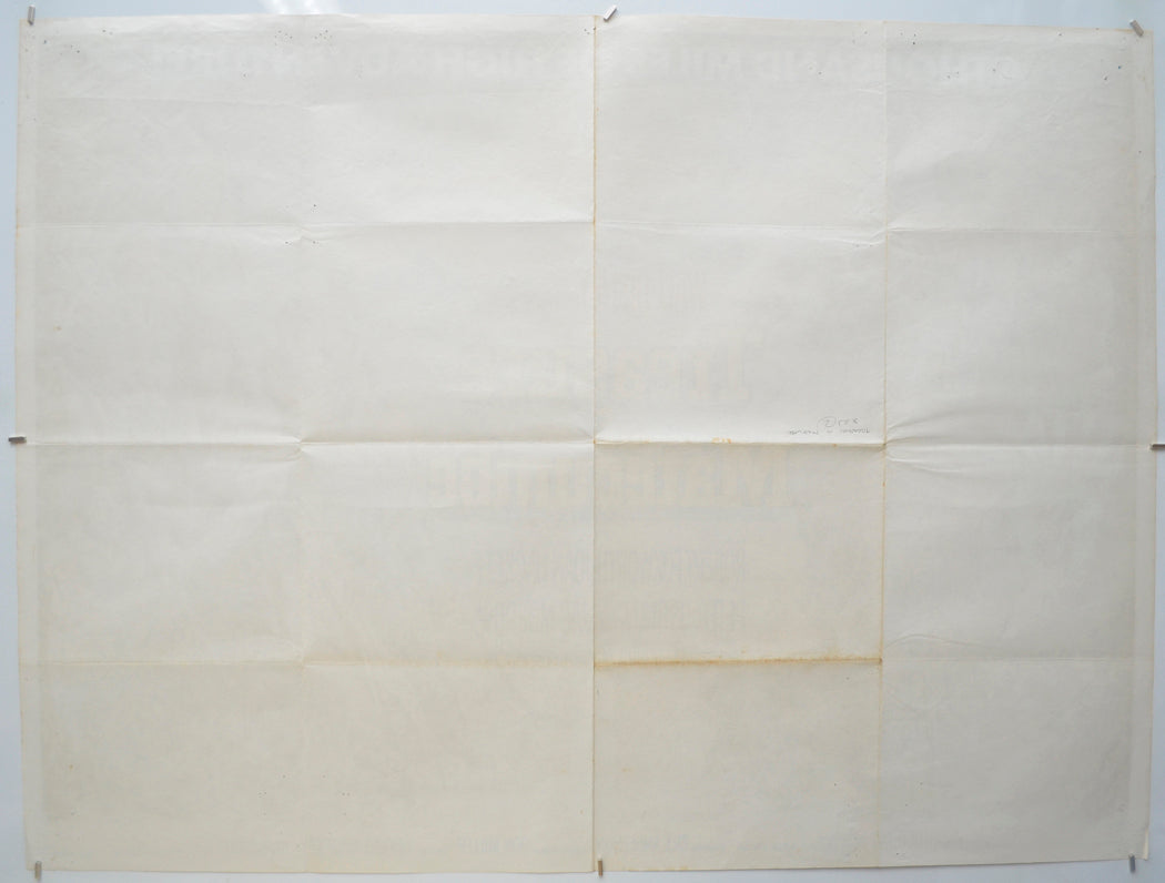2 cm thin light Brown patch of damp on the top edge (near left corner), 1 cm tear at the top of the right vertical fold line, a few tiny light Brown spots of damp on the right edge/in the right border (foxing), a couple of tiny tears on the right edge, 11 cm diagonal crease across the bottom right corner, four small light Brown patches of damp on the bottom edge (left of center), a couple of light greyish marks and a small spot of print loss near the bottom of the left border, three tiny dark spots of print near the top of the left border, approximately 7 to 15 pinholes near every corner and also around the top and bottom of all three vertical fold lines (some are several centimetres inward of the edges), six pinholes around both the left and right fold intersections along the top horizontal fold line, extremely mild fold wear (light creasing around some the fold intersections) note there are three horizontal and three vertical folds, Browning/Brown spots of damp on the back of the center and right vertical fold lines and the back of the left half of the center and bottom horizontal fold lines (a couple of spots are visible on the front just above the S in TREASURE and within the first M in MATECUMBE… The rest is only really visible on the front if the poster is held to light/backlit), otherwise very good!