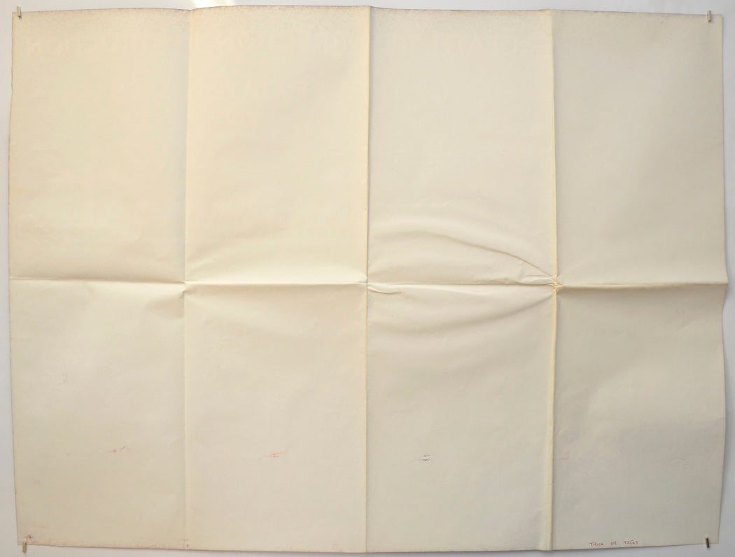 Three light diagonal creases across the top left corner (longest is 17 cm), mild creasing to the top half of the right edge, mild creasing to the right half of the bottom edge, light speckles within the dark print near the top edge (due to the print saturating through to the back of the paper), additional creasing around the bottom half of the left vertical fold line due to being folded slightly out of alignment and refolded, mild fold wear (some stress marks on the fold lines), creasing between the left and center vertical fold lines (either side of the center horizontal fold line), light surface creasing near both side edges, small white surface crease through the jaw of the creature near the bottom right corner, light surface crease on the left shoulder of the boy at the bottom center, otherwise very good. (In my opinion it would look excellent if framed).