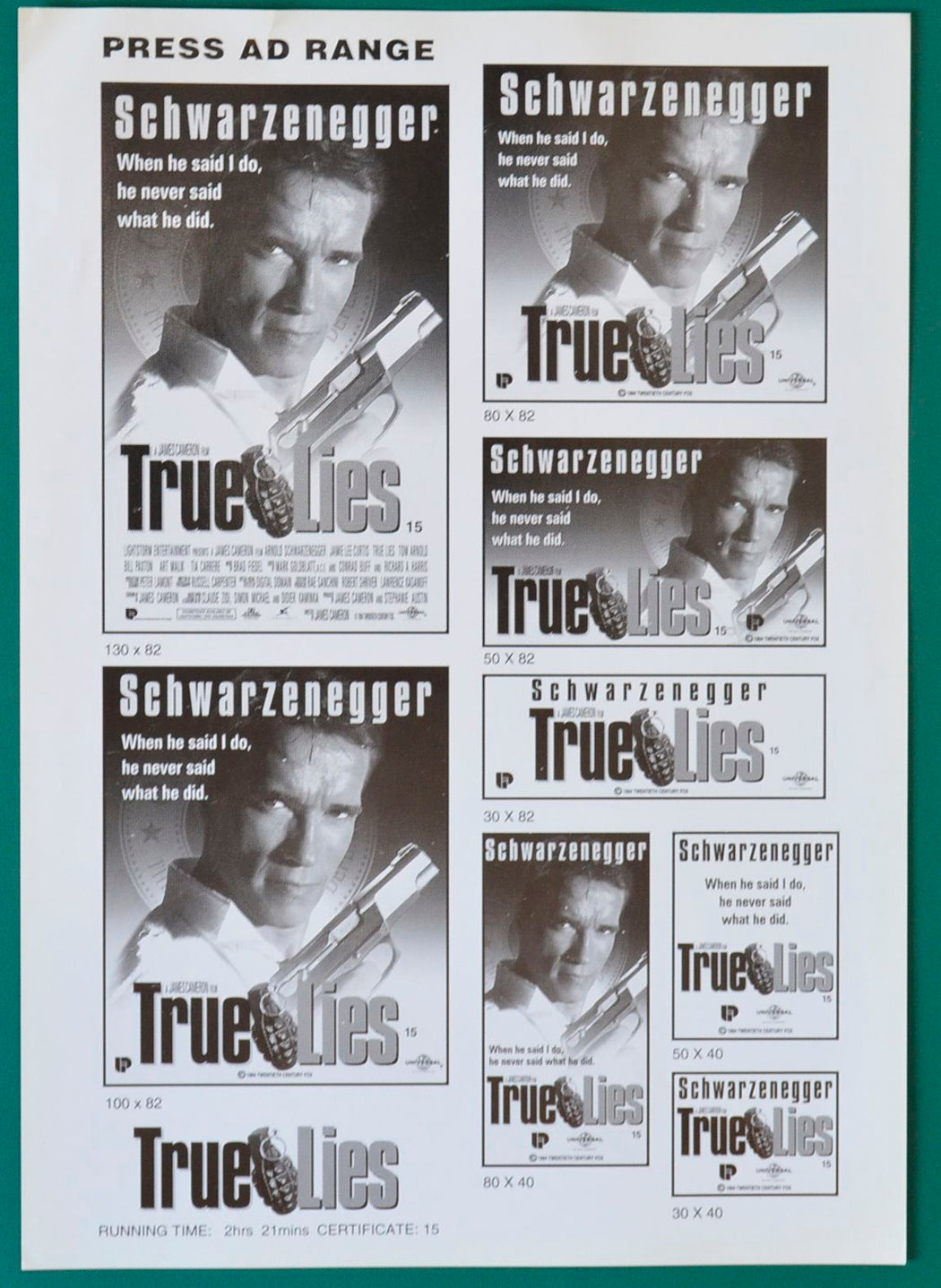 “True Lies” Original 4 Page Cinema Exhibitors Synopsis / Credits Card + Advertising Blocks Sheet
