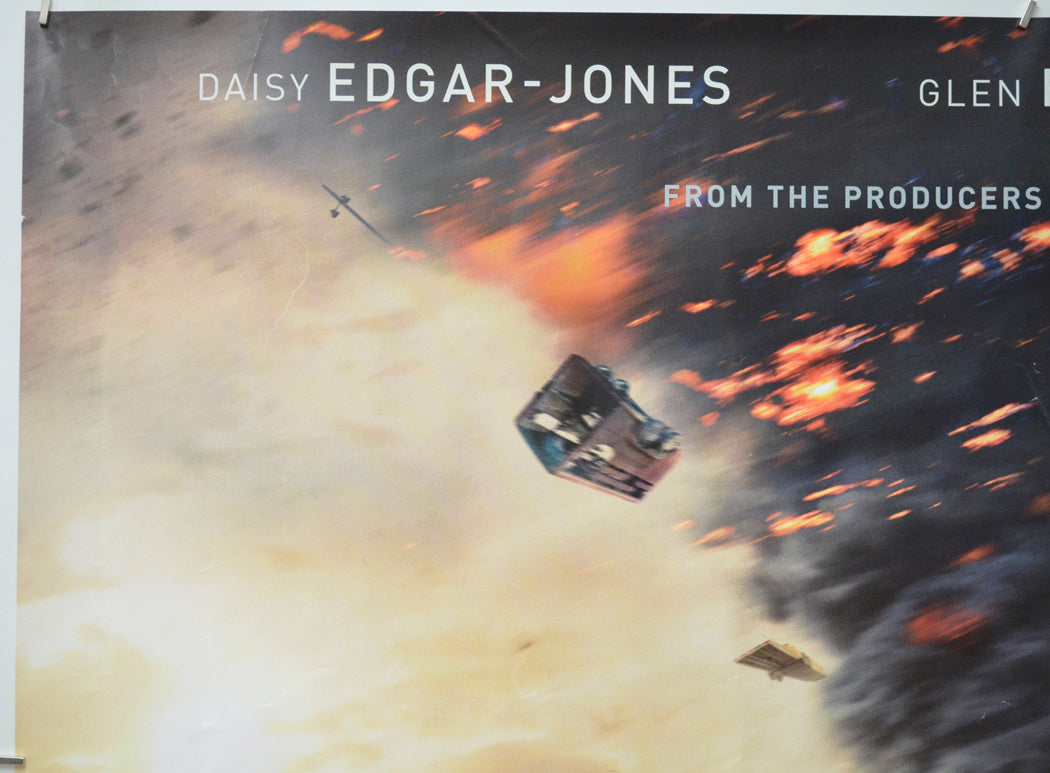 5 cm diagonal white crease line from the top edge down into the DAISY credit, 4 cm jagged surface crease and a couple of smaller creases near the top left corner, extremely mild creasing on the top edge, small tear and very mild creasing on the right edge, mild creasing on the bottom edge, tiny tear near the top of the left edge, numerous light vertical roll creases/waves from top to bottom throughout the poster (these are heavier on the left where there are some pinch marks around the central area of the creases.. in the bright Sun area and to the right of it), a couple of small white surface creases within the main central area of the twister, some light surface creasing around each corner, otherwise good.