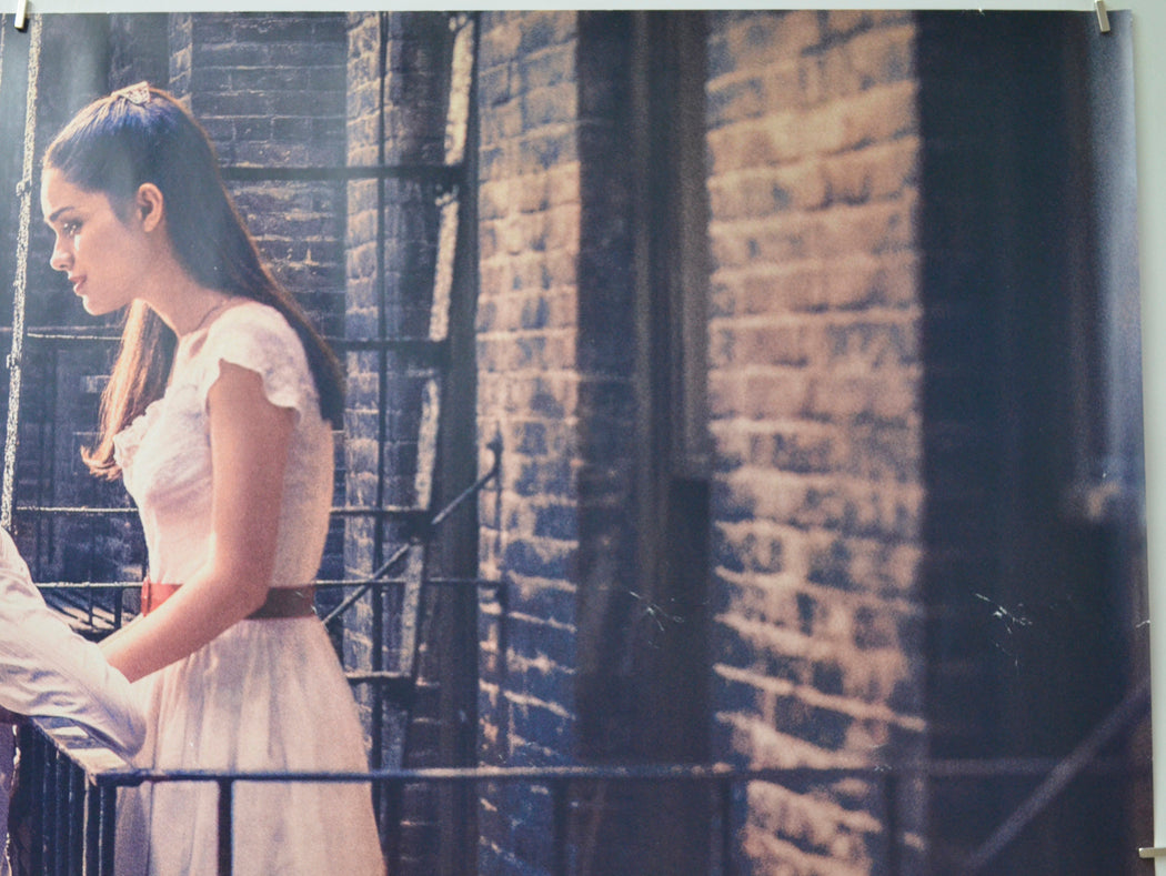 Two horizontal bands of approximately seven 3 x 3 cm surface pinch creases evenly spaced across the poster (the first going through Zegler’s waist level and the other through Elgort’s elbow level) these are quite noticeable as there are white stress lines within the creasing, 2 cm vertical white crease line and a couple of smaller creases near the right edge, small tear and two small white creases on the right edge, 3 cm patch of creasing and with two 1 cm tears within it on the bottom edge (near left corner), some additional light creasing on the bottom edge, two tiny tears and very mild creasing on the top edge, light 3 cm surface crease just below the top edge (left), otherwise okay.