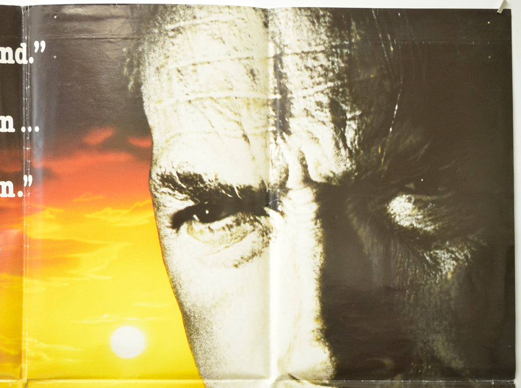 Additional horizontal fold line across the top of the poster (4 cm down from the top edge) and another just above the bottom edge, 5 cm diagonal crease across the top left corner area, tiny tear and very mild creasing on the top edge, mild creasing to the right and bottom edges, additional creasing around some of the fold lines due to being folded out of alignment and refolded (a couple are at a slight diagonal), 2 to 3 pinholes near every corner and the center of the top and bottom edges, pinhole near the center of the side edges, pinhole just left of the left fold intersection, fold wear (white stress marks on and around most of the fold lines), a couple of light scuff marks near the top left corner, two faint indentation circles either side of Eastwood’s right eye, a couple of faint liquid splashes on the back and the title has been written on back in black crayon (only noticeable on the front if the poster is held up to the light / backlit), four pinholes just below Eastwood’s right eye, otherwise okay.