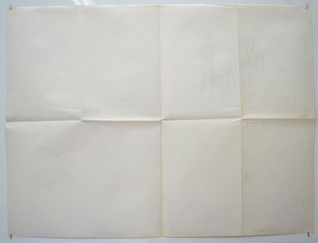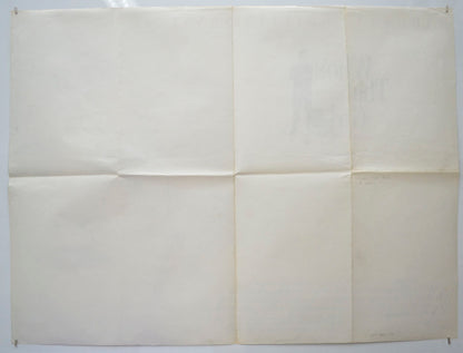Mild creasing around the top left corner, two tiny tears and extremely mild creasing/edge wear on the top edge, slight Browning/Brown speckles of damp along the tip of the top edge, tiny tear and very mild creasing/edge wear around the center of the right edge, two tiny tears and very mild creasing on the bottom edge, some light surface creasing near the left edge and also between the left and center fold intersections (either side of the center horizontal fold), tiny pinhole near the top right corner, the back of the left vertical fold line and the back of the bottom half of the center vertical fold line have browned slightly as has the back of the left of the center horizontal fold (this is lightly visible on the front due to being mostly white background… More noticeable if the poster is held to light/backlit), title written on the back of the bottom left (only noticeable on the front if the poster is held up to the light / backlit), otherwise very good.